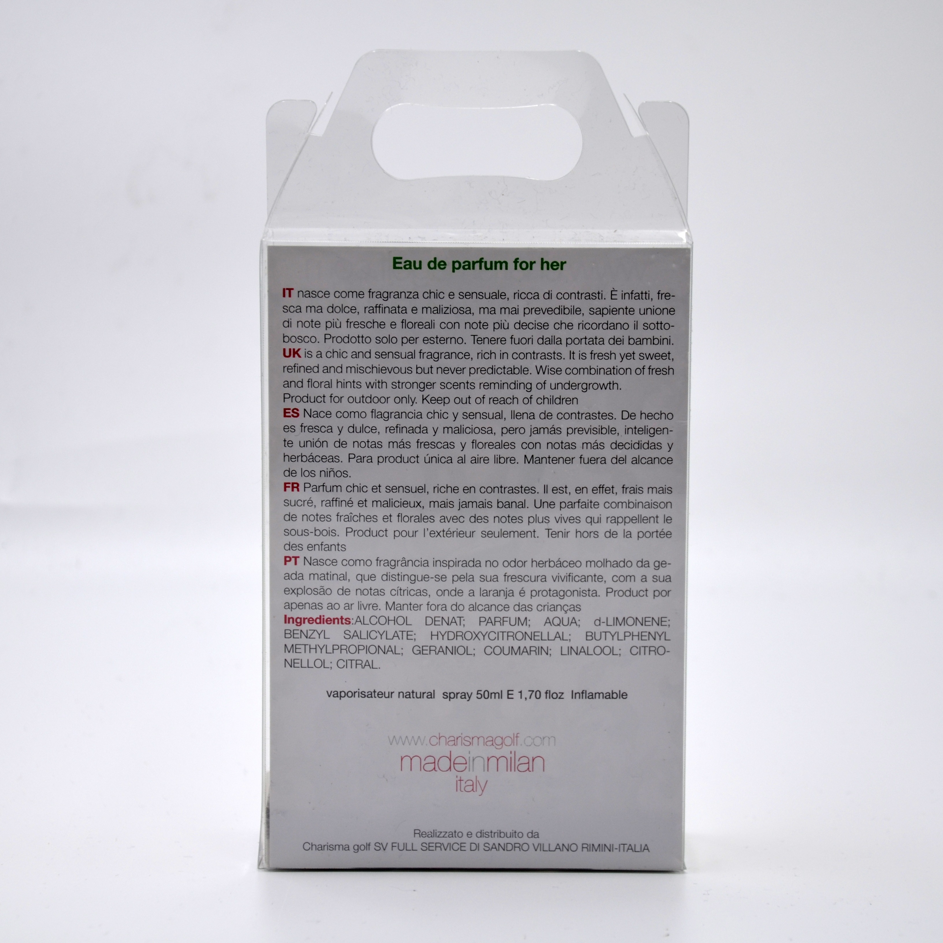 | Feature   Charismagolf for her, is a chic and sensual fragrance, rich in contrasts | It is fresh yet sweet, refined and mischievous but never predictable. Wise combination of fresh and floral hints with stronger scents reminding of undergrowth. At first, the fragrance is both fresh and sweet thanks to the blend of important Orange hints, floral Neroli and sweet Raspberry scents. The core includes sensual Orange, Gardenia and Jasmine flower fragrances. Lastly, these fresh floral notes are replaced by undergrowth nuances composed of patchouli, Cashmeran wood and sweet hints of honey and vanilla. | |||