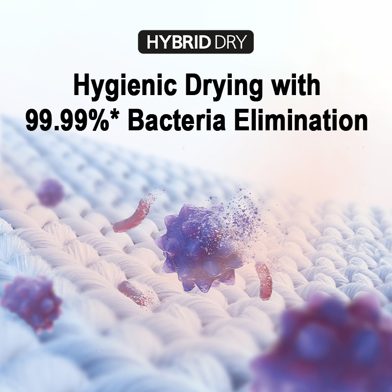 Eliminates 99.99%* of bacteria by keeping laundry temperature at approximately 65°C during drying to provide utmost protection to your family while keeping your clothes in their optimal condition.
