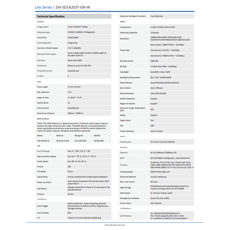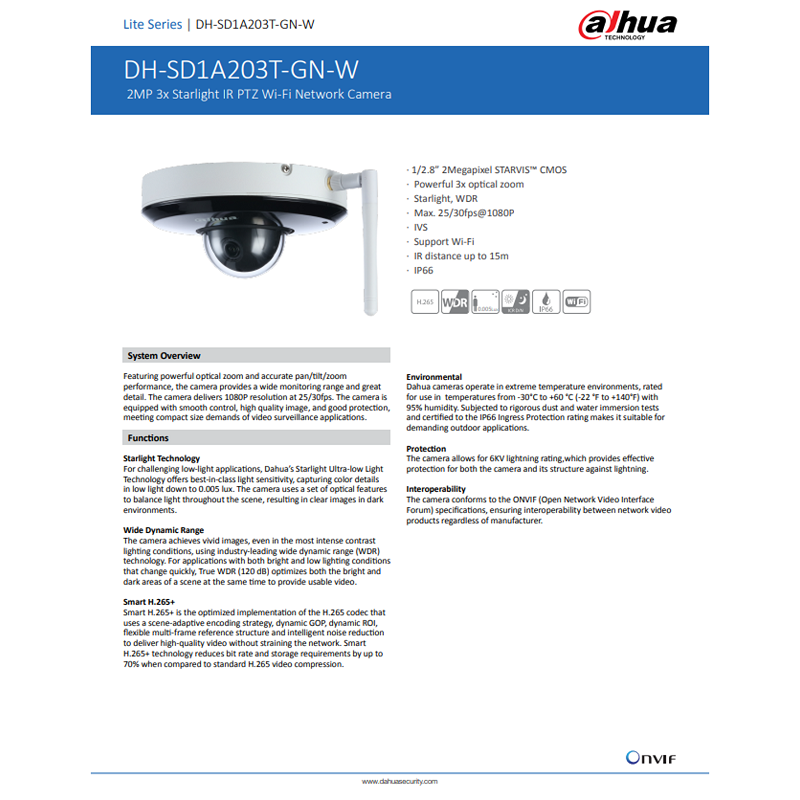 Dahua WIFI 2MP 3x Optical Zoom CCTV Starlight IR PTZ Network IP Camera with SD Slot [Order Model:DH-SD1A203T-GN-W]